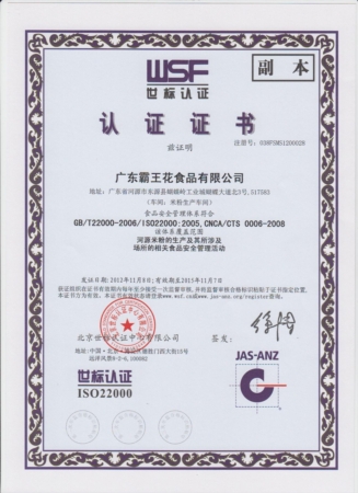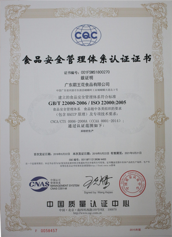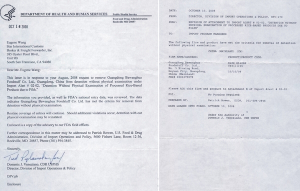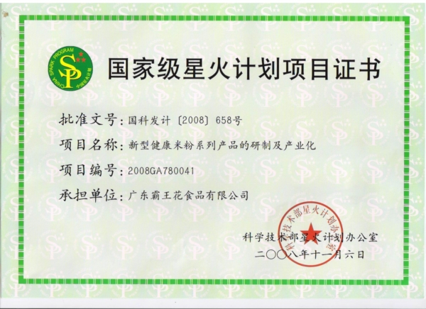 2008年獲得了美國食品及藥物管理局發(fā)放的免檢文件,廣東霸王花食品公司的“加工米制產(chǎn)品”符合美國進口免檢的標準。
