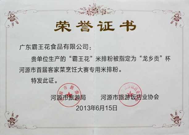 2013年6月15日被河源市旅游局、河源市旅游飯店業(yè)協(xié)會指定為“龍鄉(xiāng)貢”杯首屆客家菜烹飪大賽專用米排粉。
