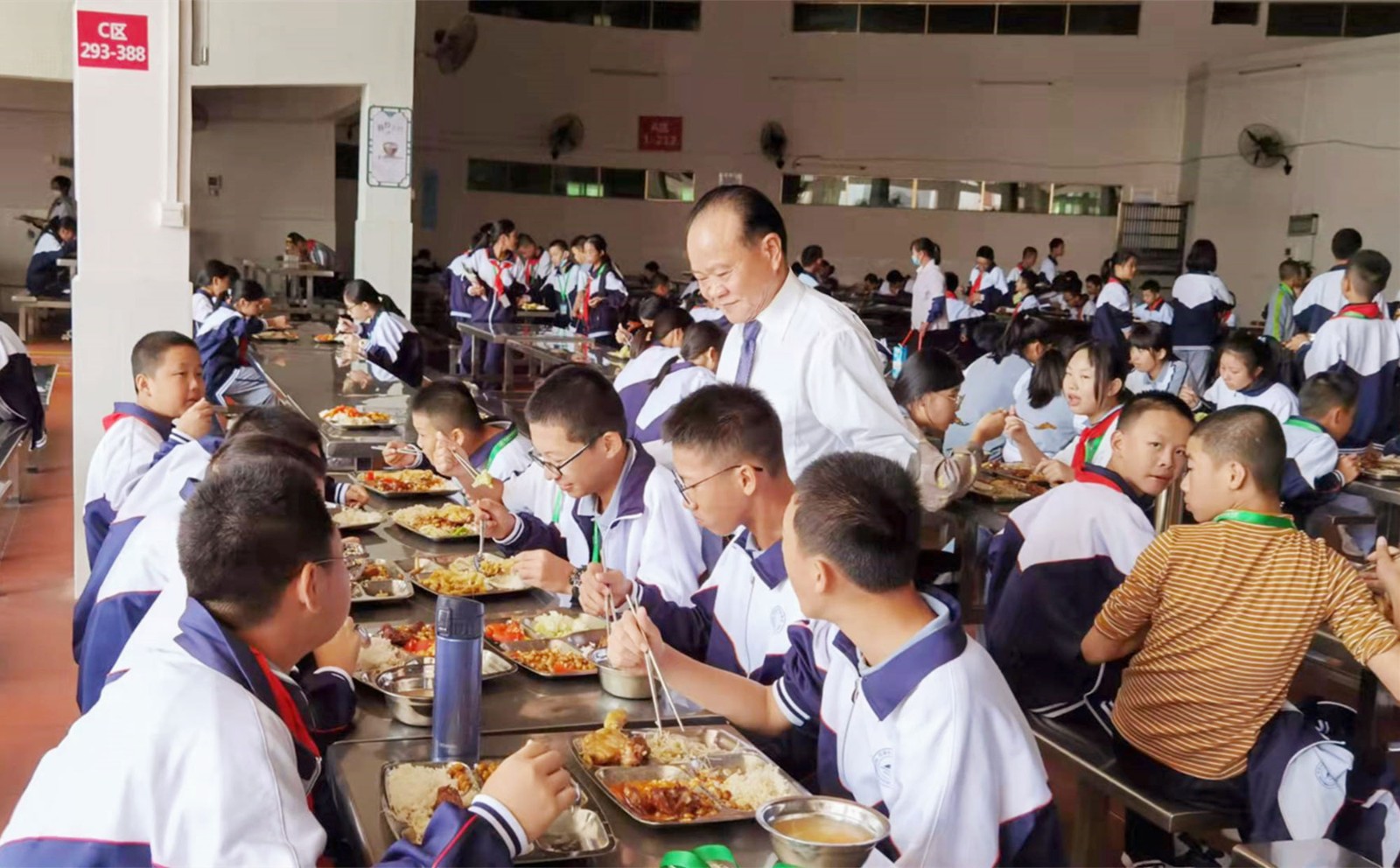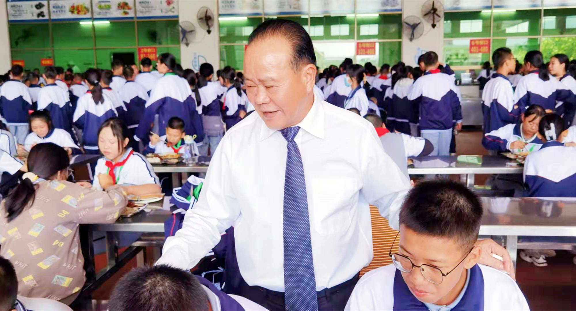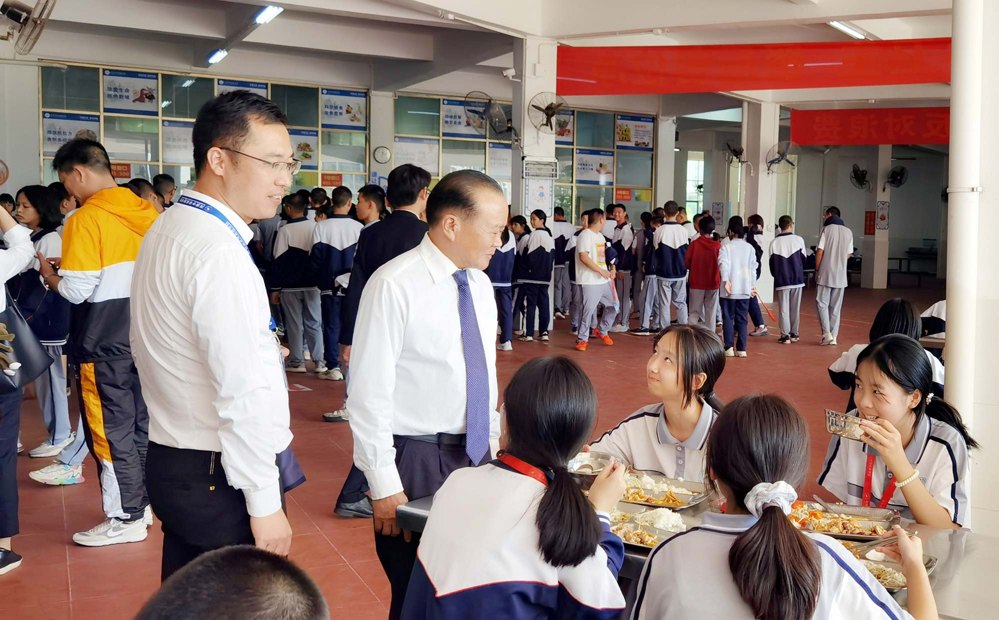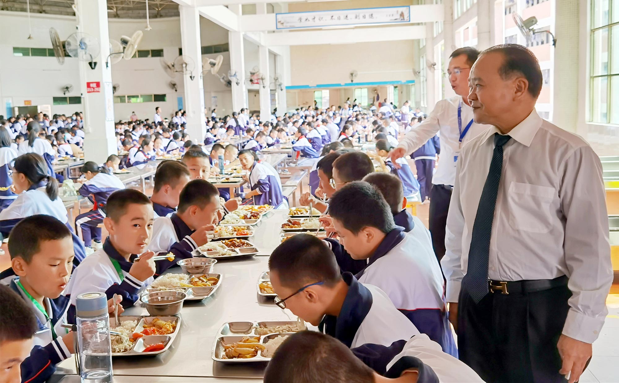 10月18日,廣東霸王花集團(tuán)董事長(zhǎng)朱日楊先生親臨集團(tuán)旗下河源市新河實(shí)驗(yàn)學(xué)校飯?zhí)茫趯W(xué)校常務(wù)副校長(zhǎng)謝輝華、初中部校長(zhǎng)李偉紅等陪同下,深入了解師生用餐情況。